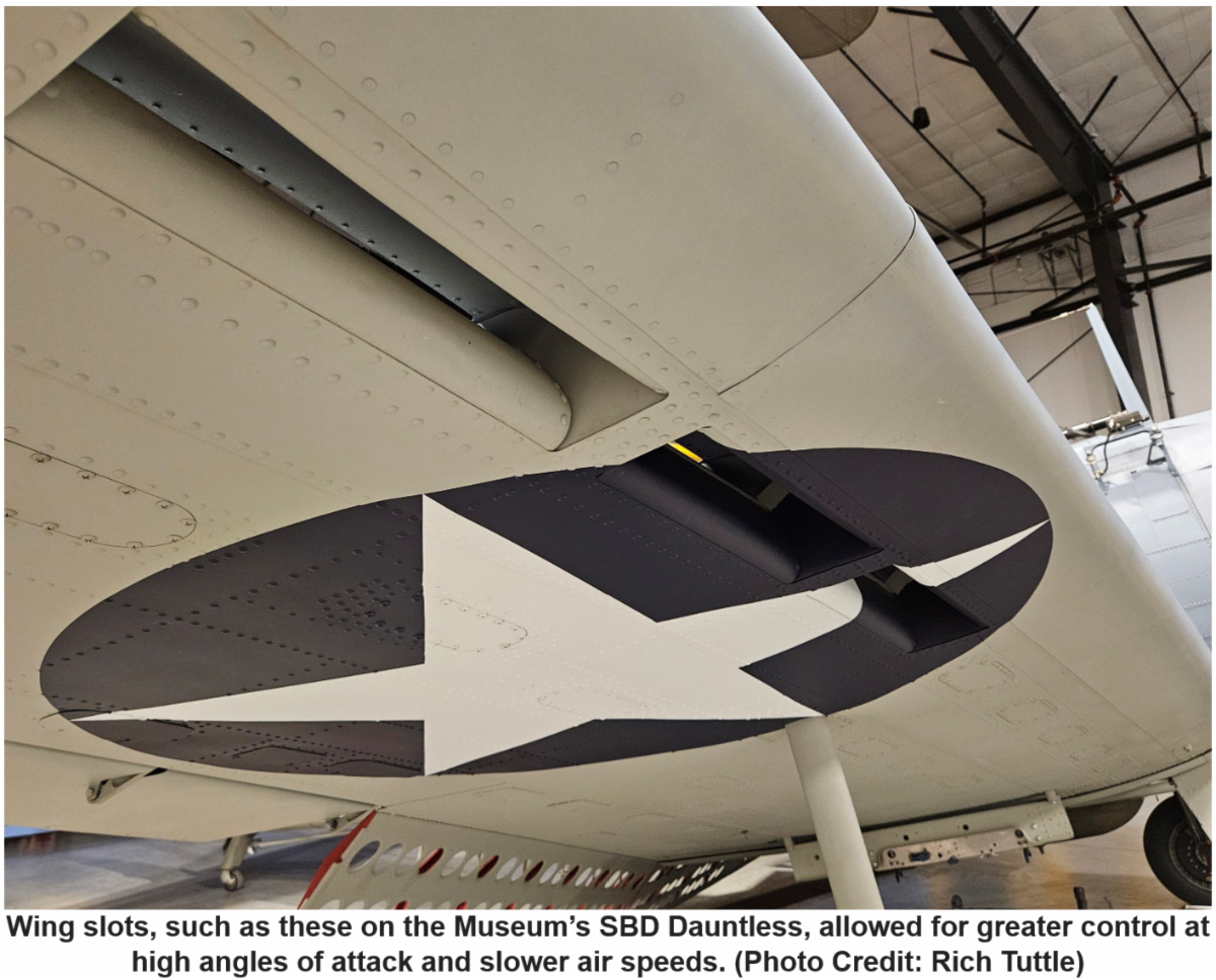 The Dauntless, for instance, has slots in its wings to ensure proper flow of air over the wing and impacts effectiveness of ailerons, even at the high angles of attack needed to get the airspeed down to just above stall.