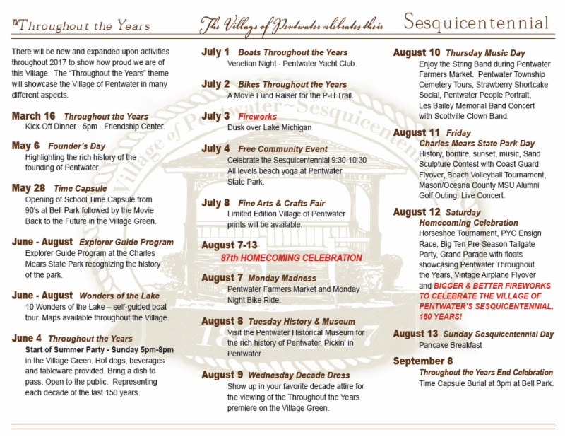 The Village of Pentwater kicks off it's celebration of it's 150th anniversary on March 16, 2017. In 2017 we will look back at the days gone by in the Village of Pentwater. From looking at how it has changed over the years to mapping the village's growth to remembering some of the most infamous moments. There will be new and expanded upon activities throughout 2017 to show how proud we are of this Village. The "Throughout the Years" theme will showcase the Village of Pentwater in many different aspects.