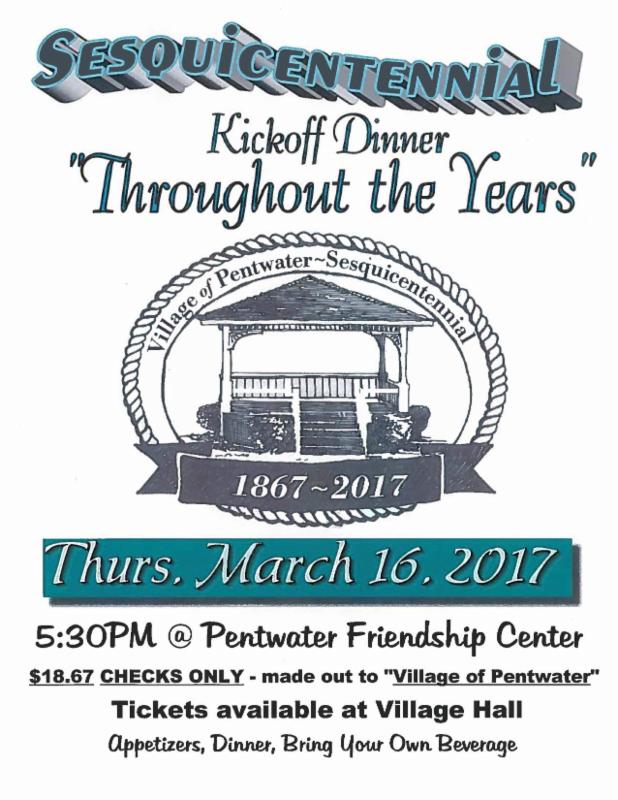 The celebration will begin March 16, 2017 with a Sesquicentennial dinner. It will be held at the Pentwater Friendship Center. There will be guest speakers, dinner and a slideshow of the Village of Pentwater "Throughout the Years".