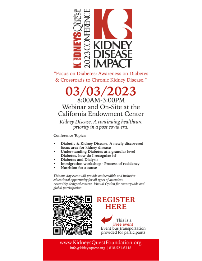If you would like to become a sponsor and have your logo on our marketing materials for the 2023 KDIC, please feel free to contact us directly with any questions you may have regarding the conference or about Kidneys Quest Foundation at info@kidneysquest.org.
