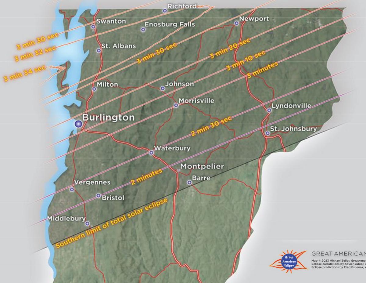 A partial solar eclipse will begin at 2:14 p.m.; at 3:26 p.m., a total eclipse will darken Vermont's daytime sky, lasting about 3 minutes. The phenomenon will continue as a partial eclipse until 4:37 p.m. The area impacted by the eclipse will be an east-to-west line from St. Johnsbury, Barre, and Middlebury north to the Canadian border.