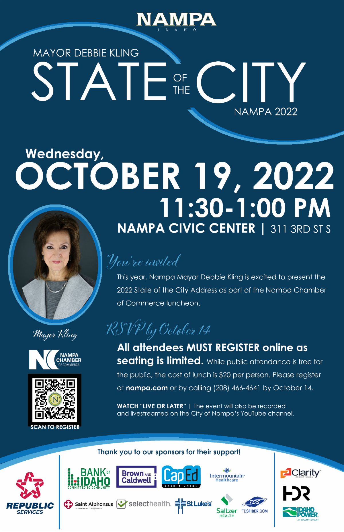 You're Invited: Mark your calendars for Nampa's 2022 State of the City address which will be held at the Nampa Chamber of Commerce's October 19 luncheon. Reserve your luncheon ticket ($20) or RSVP to attend without lunch (free, limited seating) here and by October 14.