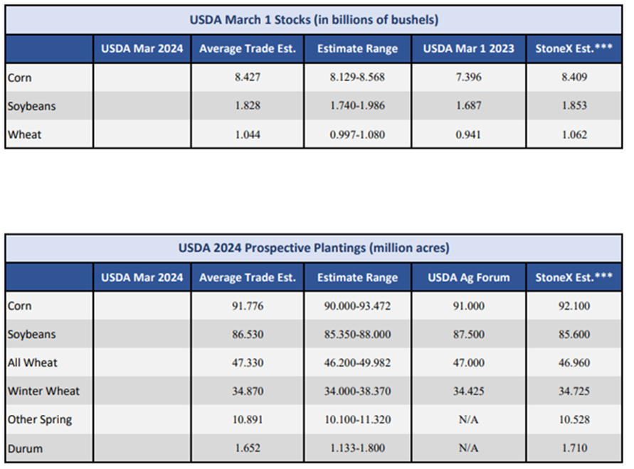 The fear is real today with the USDA data dump tomorrow looming. The trade has priced in increases in old crop stocks of corn, beans, and wheat (as of March 1, 2024) versus stock levels reported a year earlier. The big wild card in stocks numbers are always the USDA “projections” of how much grain has been fed in the last quarter, as exports, soybean crushing, and corn for ethanol numbers are well known from a year to date perspective. On yesterdays and todays price action the grains did take out some downside support, especially in corn. Karen Braun summarized the corn situation saying, "CBOT corn futures have not reacted poorly to the March stocks & acres report since 2019. March 1 corn stocks are on a 4-year streak of coming in lighter than expectations, and that followed 5 years of heavier stocks. Trade bias is mixed on acreage, but misses have been large". Although we have taken out almost 2.6% of the spot corn price in two days, we have unfortunately tested the water lower than this before, and may do so again depending on the data that does come out. We are still almost 70 cents off of our lows on spot soybeans, so the loss potential is there for sure, as is the potential for gains. The trouble with predicting the USDA reports is that we only have access to what information the trade expects, but the USDA is known to throw some surprises into the mix.