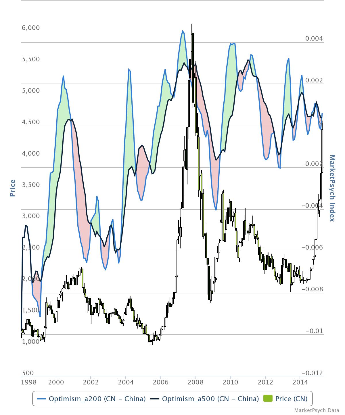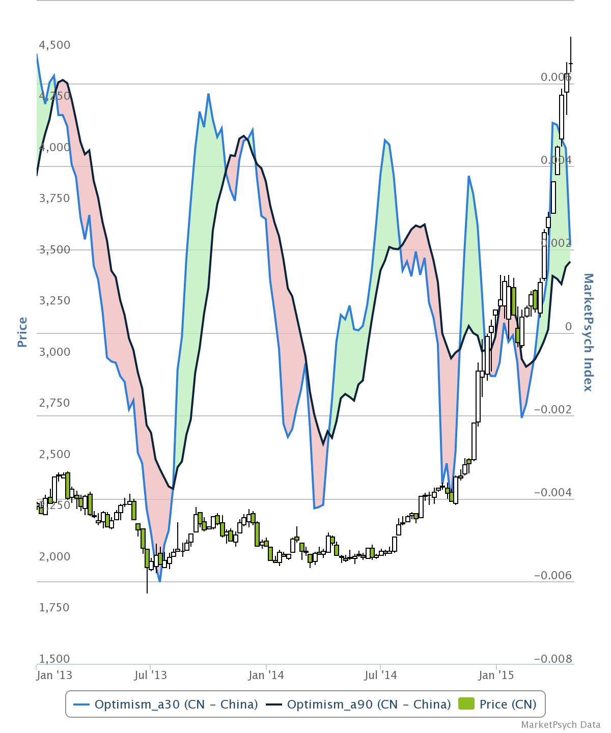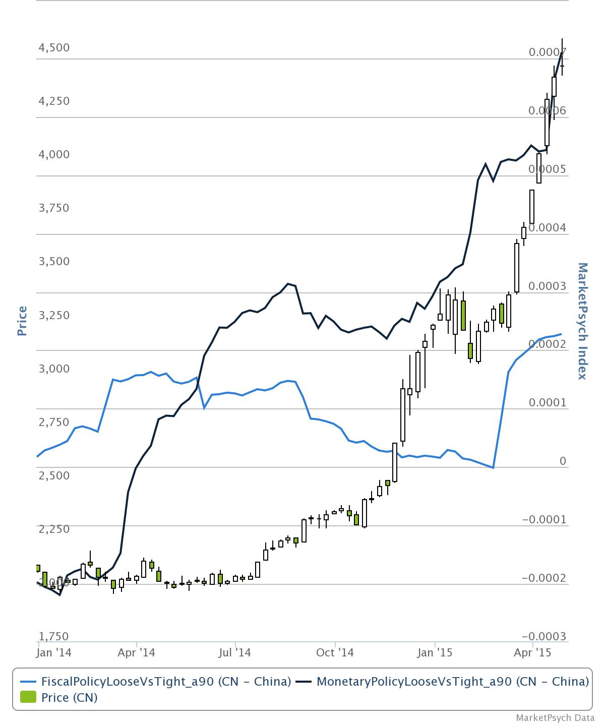 Chinese stocks (the Shanghai A-shares specifically) are up 100% in the past 12 months. For the country with the world’s 2nd largest market capitalization this is obviously a large appreciation of capital. What was the fundamental trigger for the rally? It appears to include multiple factors: government cheer-leading, monetary stimulus, the Shanghai-Hong Kong Connect stimulating internal and external interest in Chinese markets, and the near-vertical price rise (e.g., in April the Shanghai Composite was up 19%). From a valuation perspective, the market does not appear bubbly, with Shanghai stocks trading at 17 times forward 12-month earnings, less than most other G-10 markets. The Chinese government may not want equity market valuations to go higher, lest the subsequent crash create unrest. Excessive speculation may be dampened by reducing margin allowances or allowing additional IPOs (as Chinese regulators are doing in May), thus reducing liquidity. Psychologically, the new Chinese investors jumping into the market are fairly naïve, which predisposes the market to significant volatility. New stock brokerage accounts are opening at a rate of 1 million per week, and the interest of domestic investors has been accelerating. Many professionals seem to believe there is a Chinese stock bubble, and there has been an increase in short-interest. In terms of our checklist, in what stage is Shanghai’s market? Solidly in Stage 2. As one can see in the below chart, thhe fundamental trigger of loose Monetary and Fiscal policy is accelerating, which is adding liquidity to the system (some of which flows into equities).  Optimism has ranged greatly for Chinese equities since 1998, as can be seen in this moving average crossover plot of Optimism. Pink shading indicates short-term Optimism is dropping faster than longer term in the media, while green shading indicates short-term Optimism is rising faster than long-term Optimism.  A faster moving average in the past two years shows sentiment peaking in a small way, as often happens. This peak does not reflect the immense price rally we've seen so far.  As one may be able to see in these charts, the peaks in optimism followed by declines often precede price downtrends, but the current peak is relatively minor given the massive rally. Bottom line about Chinese stocks is similar to "Don't Fight the Fed." If the Chinese government wants equities to rally, then they will rally. When they turn off the stimulus, then they will fall. Given the slowness of amateur investors to act, investors who act quickly when the stimulus is going to be turned off may keep a good portion of their gains from this bubble. What will be very interesting to watch is whether the optimism of Chinese stock and global Biotech (and Tech) investors seeps into other asset prices. In the era of low interest rates, bubbles are more and more likely.