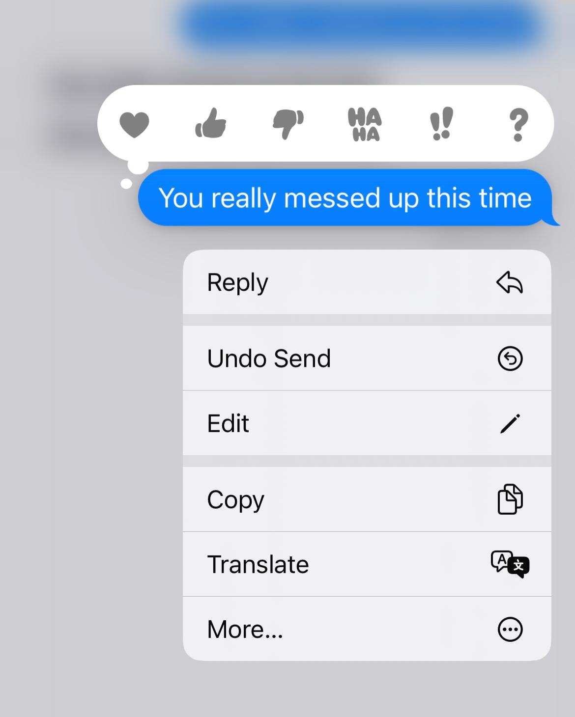 You can also edit a text message and resend it: just select "Edit" from the pop-up menu, make your changes, and send it again. The catch: you only have about 2 minutes or so to unsend or edit.