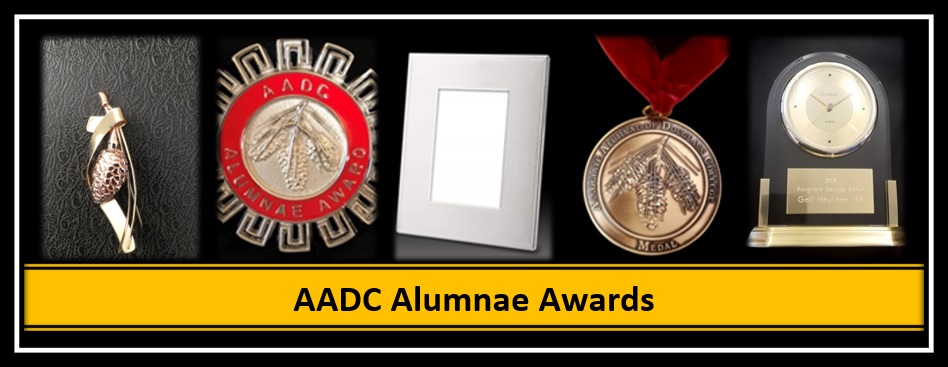 AADC awards pictured above from left: Corwin pin, Alumnae Recognition pin, Young Alumna engraved frame, AADC Medal and Vanguard Award clock.