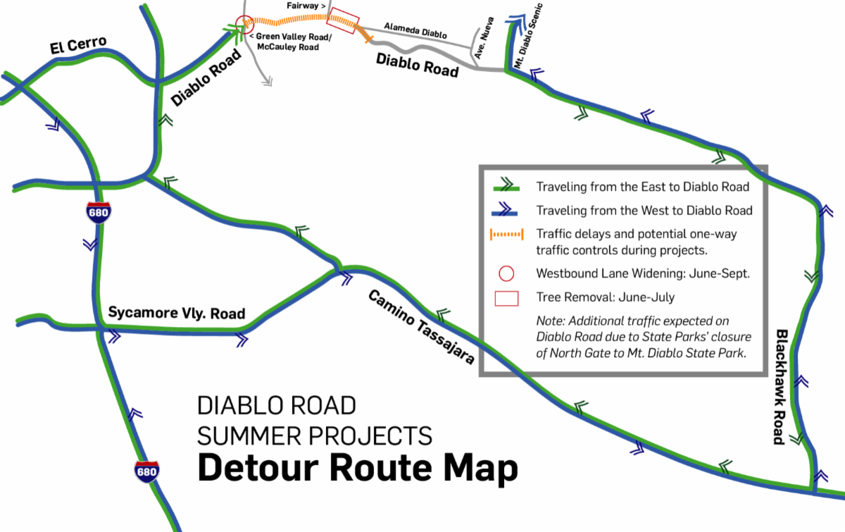 Given the construction planned on Diablo Road this summer, it is recommended to take the detour route as shown on the map below.