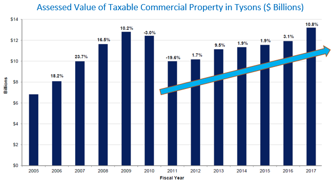 Silver Line opened in July 2014, the rate of annual growth in Tysons increased by 3.1% in FY2016 and a whopping 10.8% in FY2017.