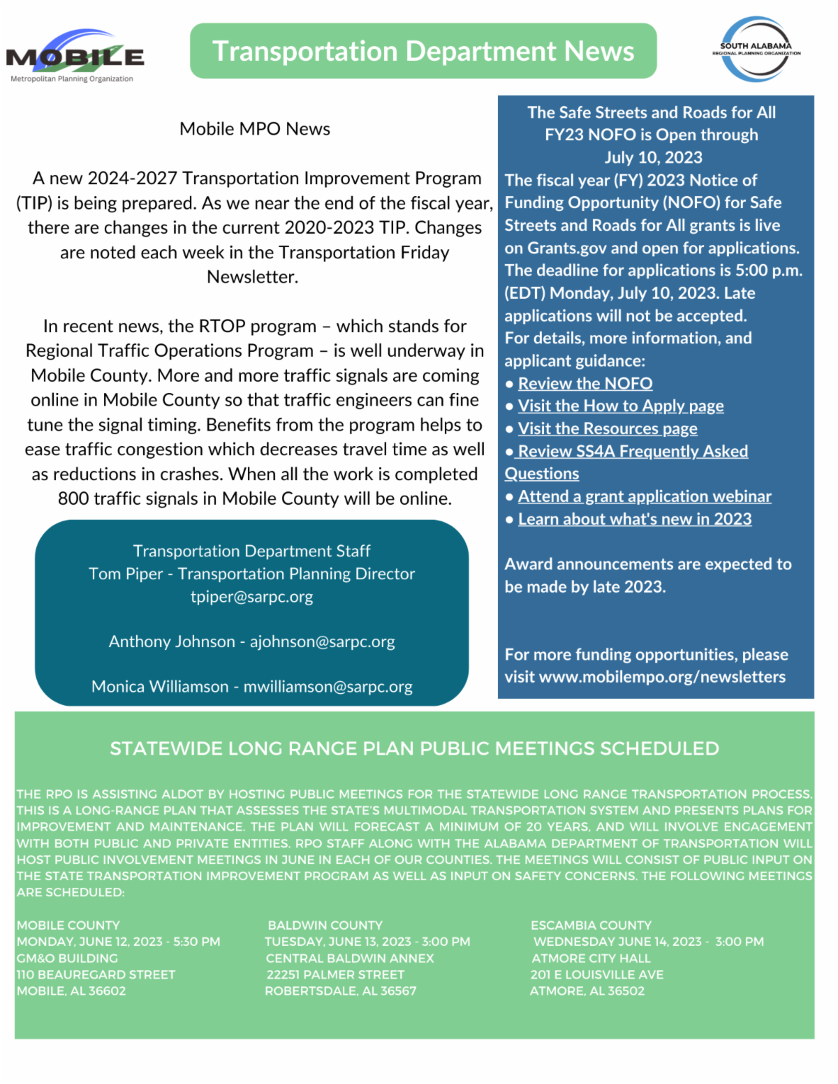 SARPC is blessed to have nearly 100 full-time employees. List includes an Elder Law Attorney and a couple of RN’s. Not to mention numerous dedicated staff who provide many services to our three County Region. New Department Directors Tom Piper (Transportation), Nicole Taylor