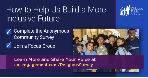 The Office of Family and Community Engagement (FACE) and the Office of Equity are partnering to better understand and accommodate the religious practices of CPS students and families. We are writing with two opportunities to share in order to gather feedback about how we can best accommodate the unique needs and aspirations among the diverse religious traditions and cultural practices of our school community: