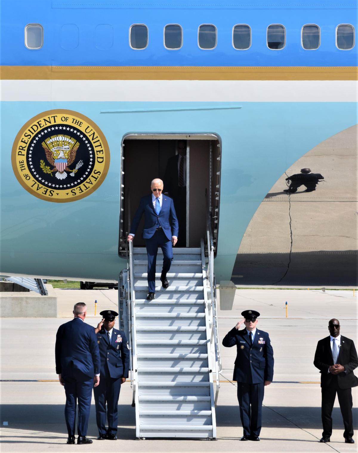 President Joe Biden landed at O’Hare aboard Air Force One on May 8 as part of a visit to the region for a campaign event in Wisconsin and a fundraiser in Chicago.