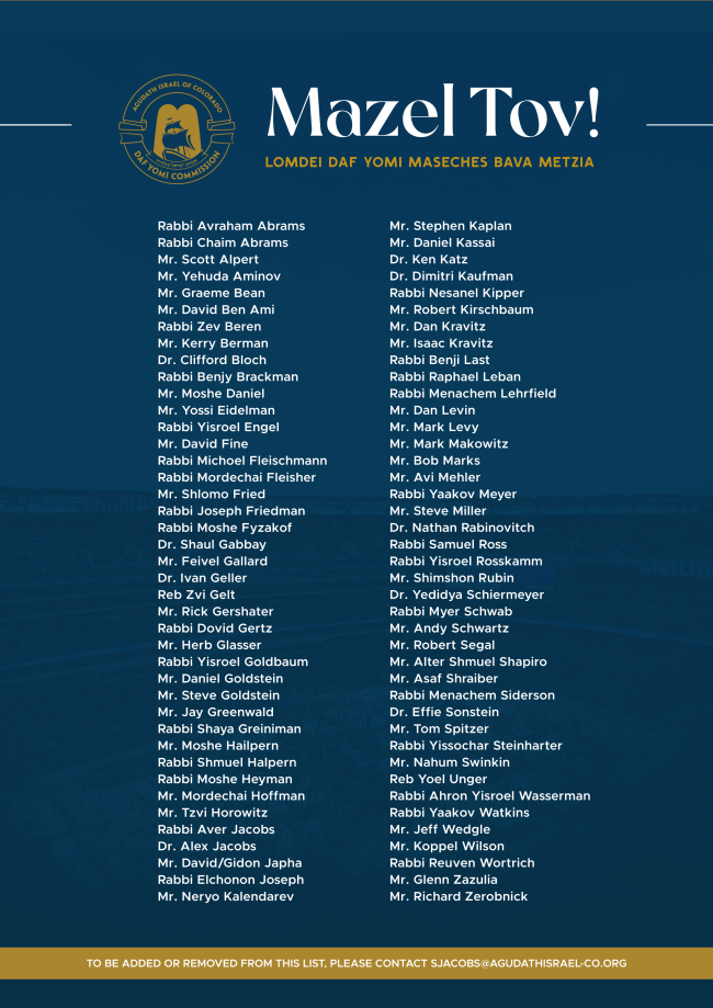 Tonight, July 26th, at 6:30 pm MST, Agudath Isreal of America will present the national Daf Yomi siyum of Maseches Bava Metziah.