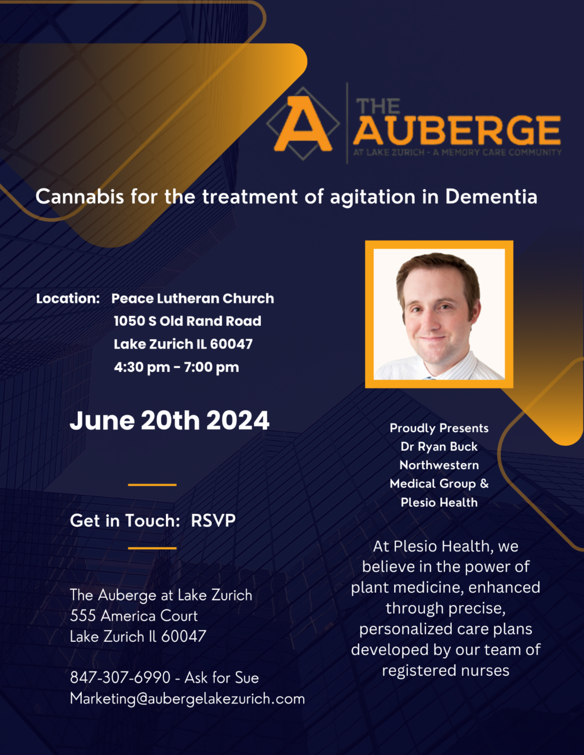 The community is invited to attend an educational session by Dr. Ryan Buck of Plesio Health, who will deliver a presentation on the use of cannabis in treating agitation in dementia patients. The event will take place on June 20 from 4:30 - 7:00 pm at Peace Lutheran Church, located at 1050 S Old Rand Rd Lake Zurich. Refreshments will be served, and attendees are encouraged to RSVP by contacting Sue at Marketing@aubergelakezurich.com or calling the Auberge Lake Zurich.