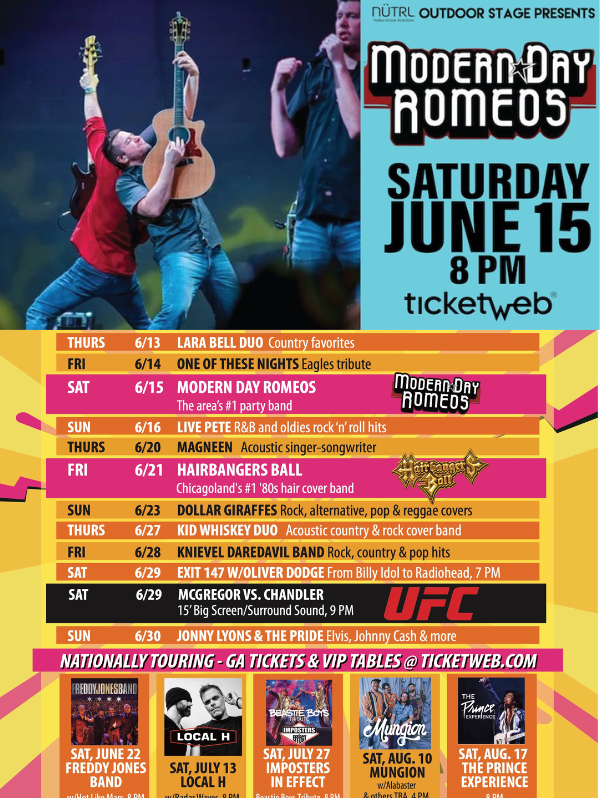 This weekend join 3D Sideouts for variety of live outdoor music, bowling, games and more. Outdoor Shows include Modern Day Romeos, Eagles Tribute and others. Plus enjoy a Free cocktail for Dad on Father's Day!