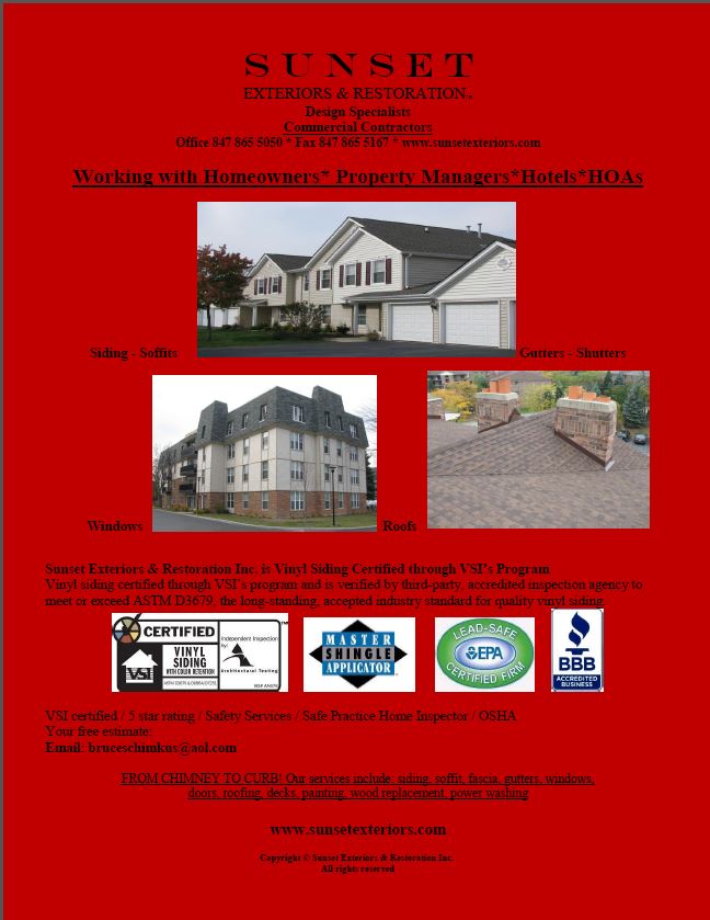 We offer full Servicing on all restoration projects. Windows, Vinyl Siding, Flat & Shingled Roofing, Soffit/Fascia & Gutters, Patio doors. Decks, Patios, Painting inside and outside. Fibercement, Dec Tec Membrane svc's Design Specialists / Commercial Contractors VSI certified / 5 star rating / CSI Certified / OSHA Safety Services / Safe Practice Home Inspector email : bruceschimkus@aol.com Certifications : http://sunsetexteriors.com/Certifications.aspx |