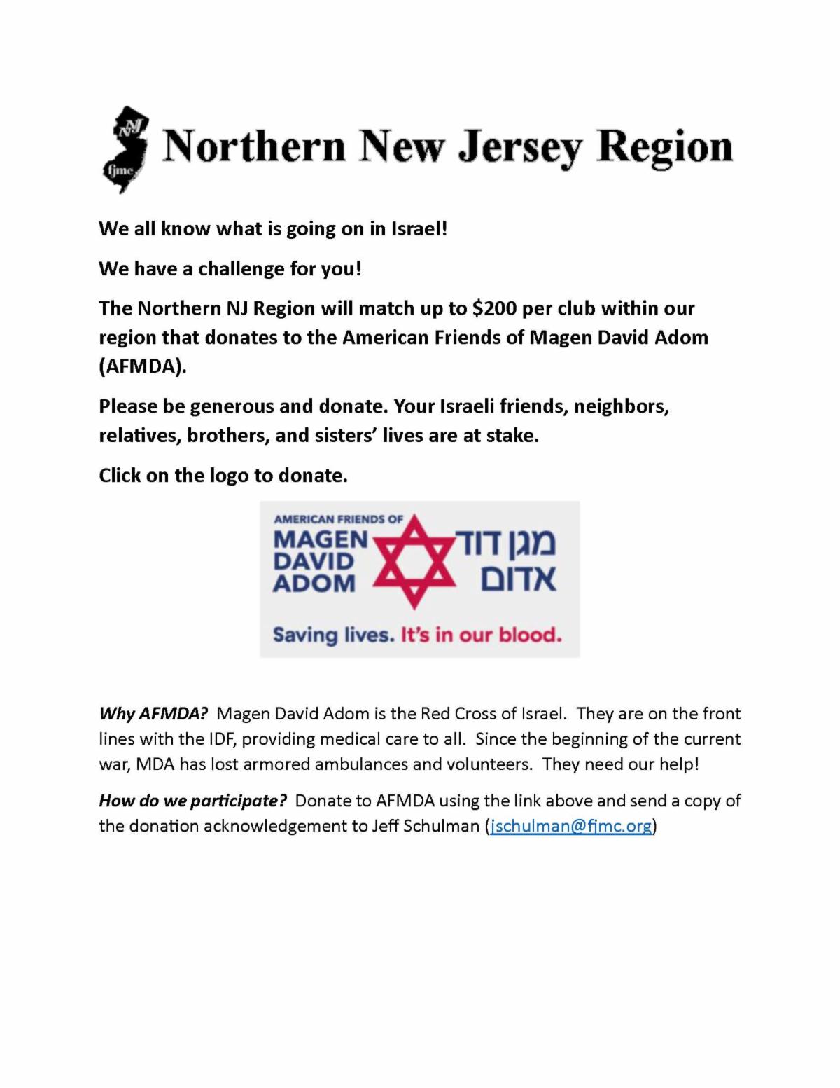 On November 7, 2023, we issued a challenge grant to the member clubs of the Northern NJ Region. The region will match each clubs’ donations to the American Friends of Magen David Adom (AFMDA) up to $200. If all of our clubs participated, that would allow all of us together to donate over $11,000 to AFMDA. At the time, we were all hopeful that the war in Gaza would be over quickly, unfortunately that is not the case as we all know.