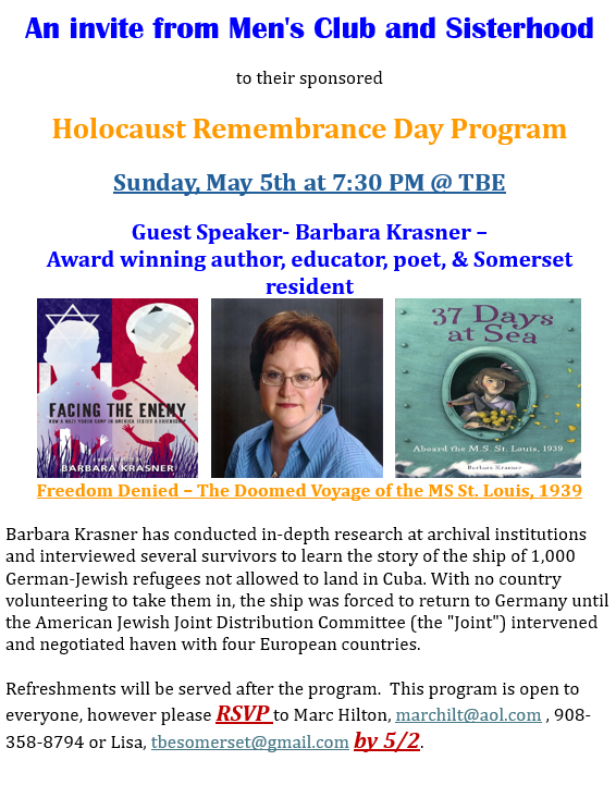 Having just celebrated our freedom from slavery with Passover we now go on to a more solemn day of remembrance with Yom HaShoah. FJMC created the Shoah Yellow Candle Program 43 years ago to keep alive the memory of the Six Million who perished in the Shoah. Now, more than ever, with the rise in antisemitism, it is imperative that we continue to remember those that perished. The program not only serves as a reminder, but also helps raise awareness and funds for programs that educate. For example, my club, East Brunswick Jewish Center, solicits donations which are in turn donated to Rutgers University Bildner Center for Jewish Life. If your club does something special, please share, as we are in this together. I want to thank all those that participated in the Yellow Candle Program with special thanks to our chair, Glenn Wohl. Yasher Koach!