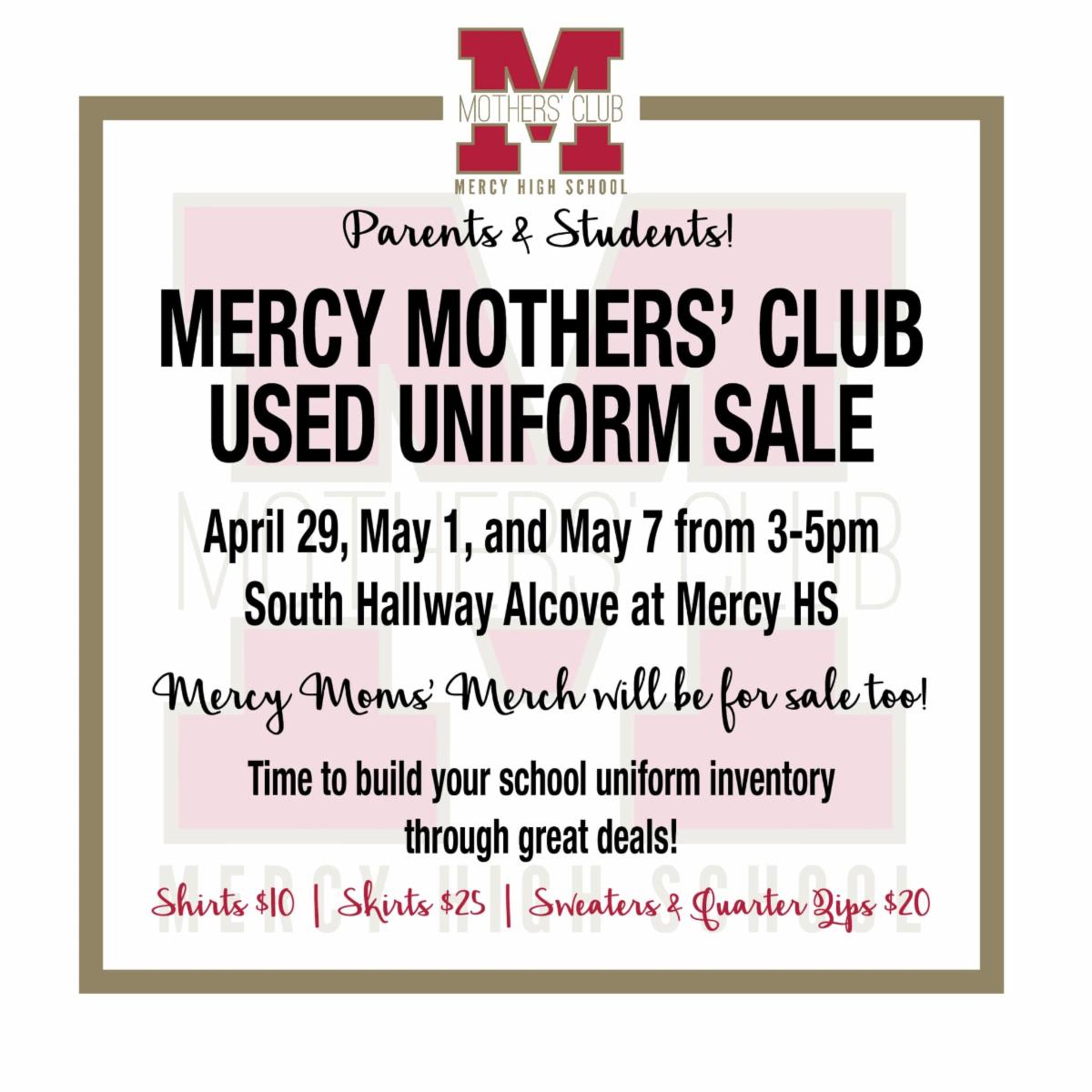 The Mercy Mothers’ Club Used Uniform Sale will be happening on May 1 and May 7 at Mercy from 3pm to 5pm! Make sure you stock up for next year. Volunteers needed! Please sign-up here if you can lend a hand during the sale. | |