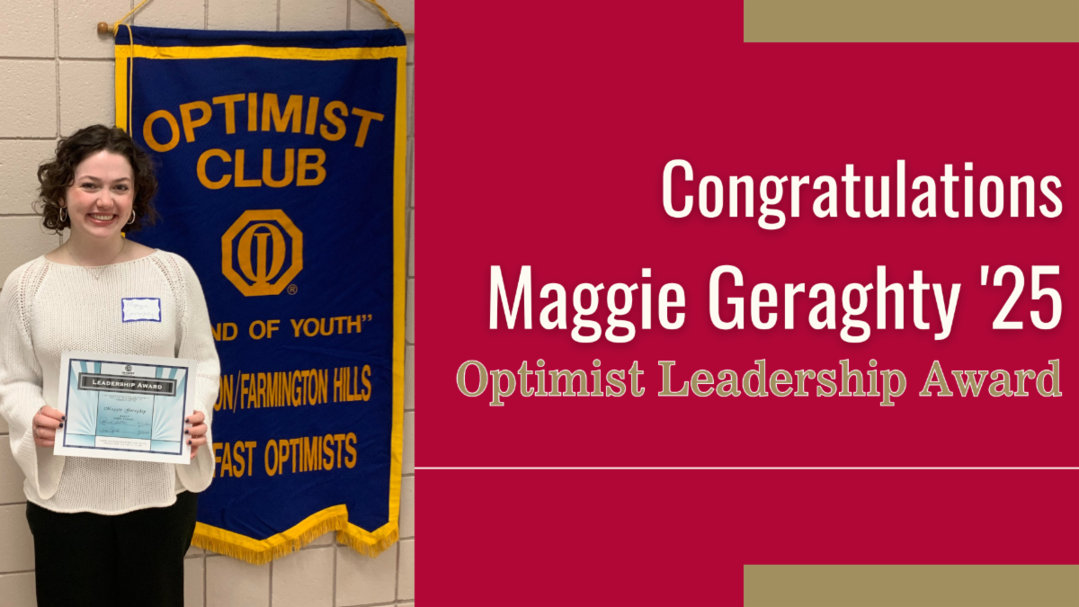 Maggie Geraghty '25 received the 2024 Optimist Leadership Award from the Farmington/Farmington Hills Breakfast Optimist Club. This award is designed to recognize Juniors who have demonstrated leadership skills and human relationship development. Congratulations, Maggie!