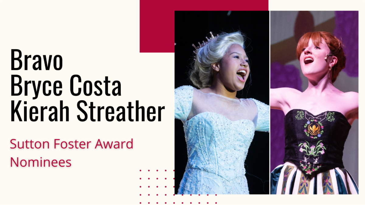 Bravo to Bryce Costa '25 and Kierah Streather '24 who were both nominated as Outstanding Performer in a Lead Role for the Sutton Foster Awards for their performances in “Frozen”. These two stellar performers are eligible to attend an intensive workshop and audition weekend as well as a Showcase of talent at the Wharton Center in East Lansing. Additionally, they may be chosen to compete at the Jimmy Awards, also known as the National High School Music Theatre Awards in New York City.