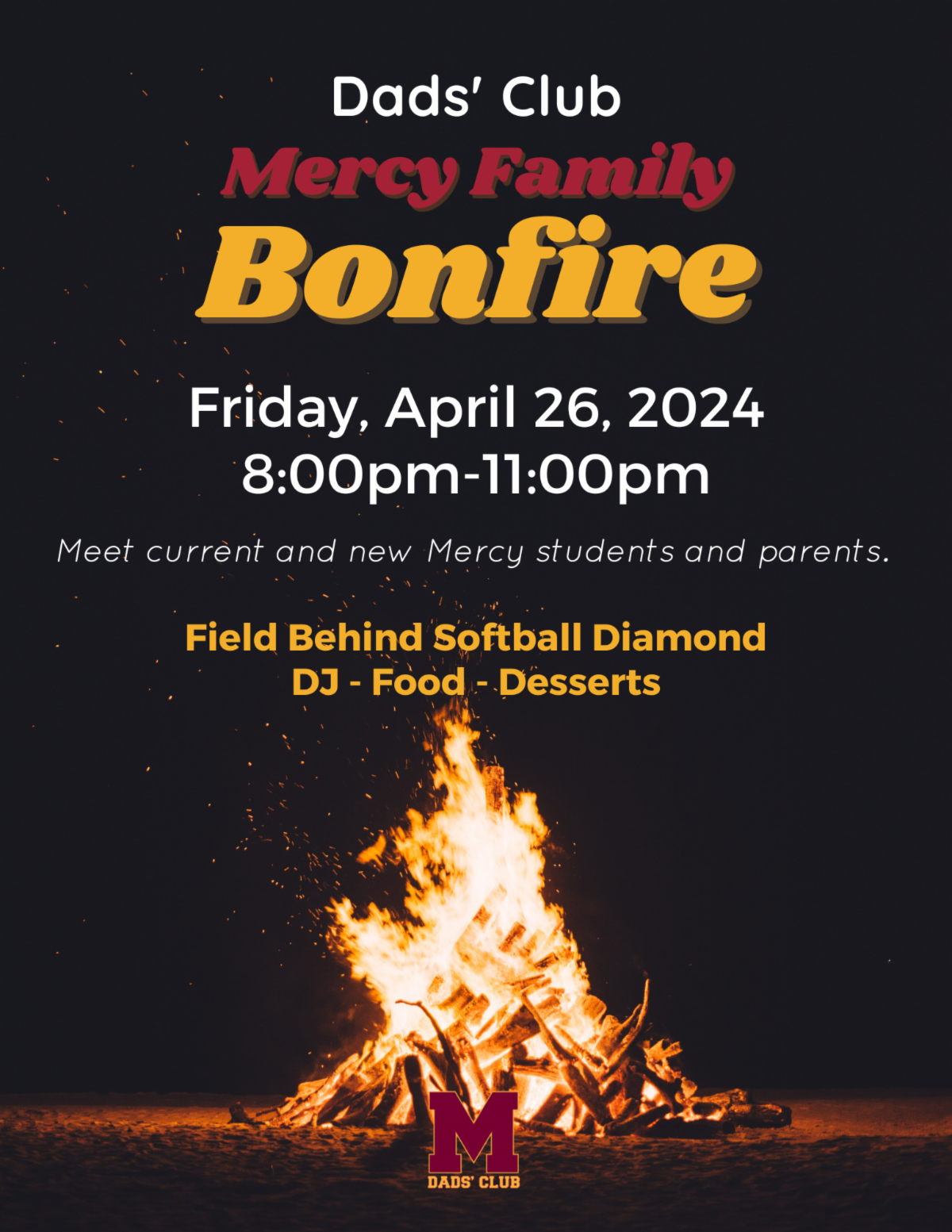 All Mercy families, students, staff and alumnae are invited to the Dad’s Club annual Spring Bonfire THIS Friday, April 26 from 8:00pm - 11:00pm at open athletic field behind Softball. DJ, food, desserts and fun!