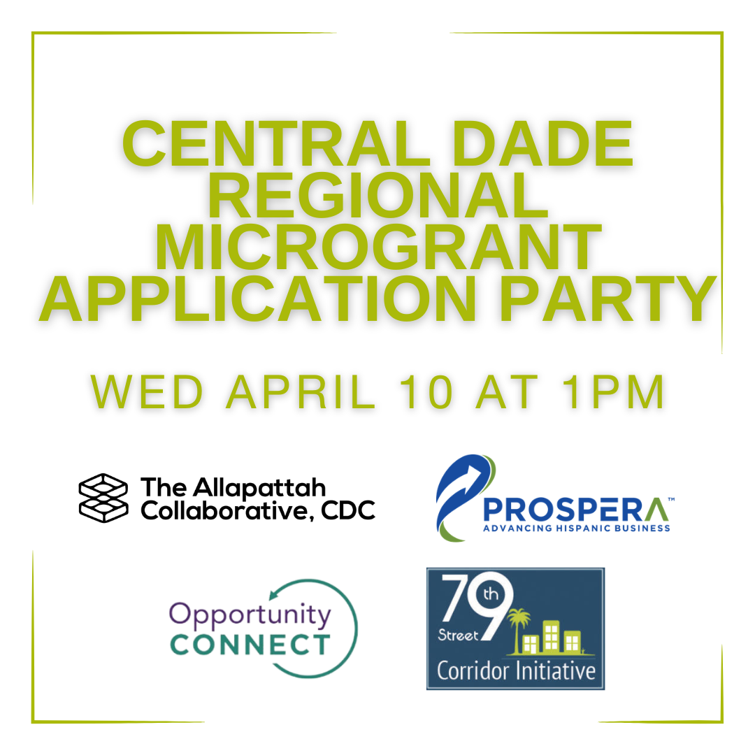 Join our Technical Assistance Providers, Allapattah CDC, Opportunity Connect, Prospera, and 79th Street Corridor for our Central Dade Application Party.