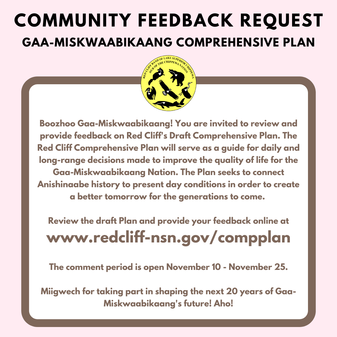 Boozhoo Gaa-Miskwaabikaang! Review and provide your feedback on the Red Cliff Draft Comprehensive Plan by visiting www.redcliff-nsn.gov/compplan.