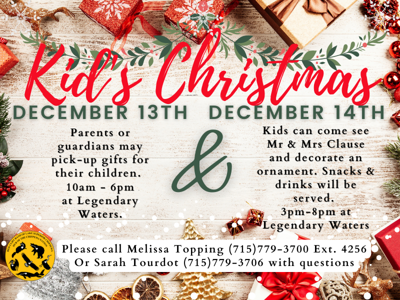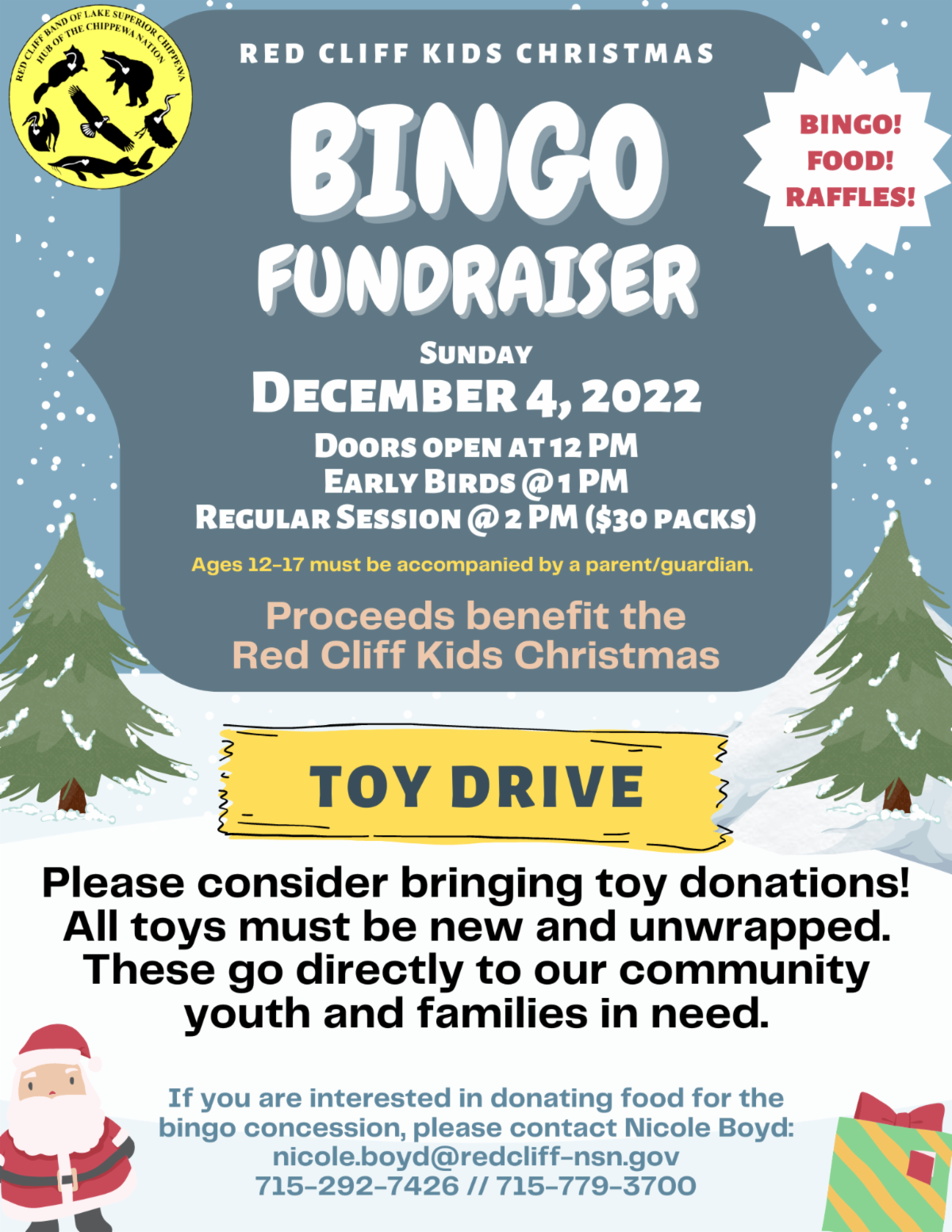 A Bingo Fundraiser and Toy Drive has been set for Sunday December 4 at Legendary Waters! Proceeds will benefit the Red Cliff Kids Christmas Event scheduled for December 13 and 14.