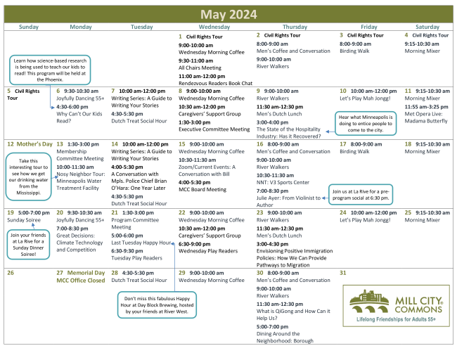 Mill City Commons is a vibrant group of individuals aged 55 and above who share a passion for connection, learning, having fun, and seeking new experiences. We are engaged in the world around us and believe friendships and a sense of belonging are important. Read on to learn about the variety of opportunities for members to gather and friendships to grow. We encourage you to join us!