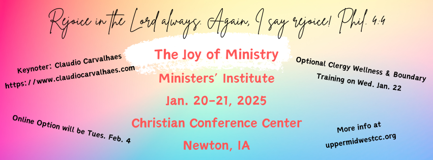 All ordained and commissioned ministers of the Christian Church (Disciples of Christ) in the Upper Midwest are required to complete a boundaries course in 2025. Our region is preparing a one-day onsite course for Wednesday, January 22 at the CCC (following Ministers Institute). There also will be an online option of multiple shorter sessions covering the same material.