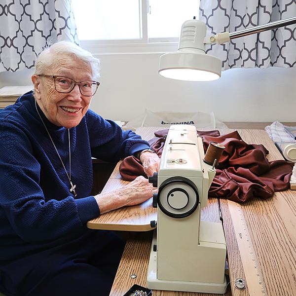 The Sisters of Notre Dame offer our prayerful support for those receiving the Sacraments of Baptism, Eucharist and Confirmation on Holy Saturday. Sr. Joann Schlarbaum sews a robe for a catechumen who will be baptized. | |