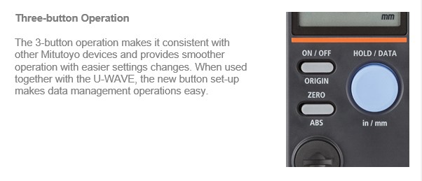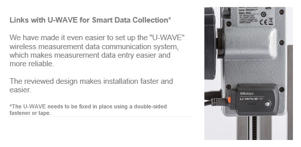 This is an update of the standard height gages that have gained a strong reputation in the manufacturing field. The DATA button is larger as well as the LCD, and the button layout is redesigned to improve operability. In addition, it is now easier to set up the "U-WAVE" wireless measurement data communication system, making the system even easier to use in smart factories and other places where measurement data output is essential.