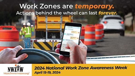 This week, April 15-19, is National Work Zone Awareness Week (NWZAW). Each year in the spring, NWZAW is held to bring national attention to motorist and worker safety and mobility issues in work zones. Work Zones are temporary. Actions behind the wheel can last forever.