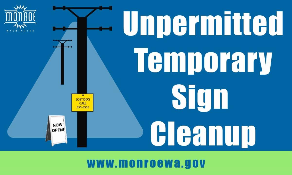 Temporary signs do require a permit from the City. There is no fee. Please contact the Community Development Department at 360-863-4501 or email landuse@monroewa.gov to obtain a valid permit. Once approved, the City will provide you with an “expiration date” label that is to be applied to the sign. The permit application can be downloaded from the City’s website.