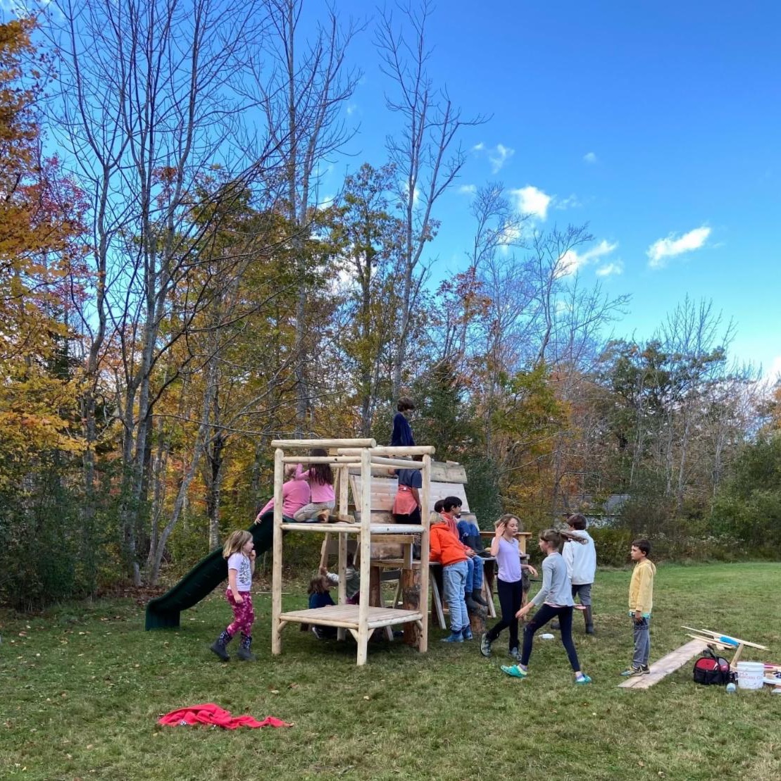 On Thursday, it was time for some finish work, securing and fine-tuning the final structures, screwing in the last boards and pieces on the climbing wall and attaching a door to the tunnel. It wasn’t until they stood the large cedar structure up that they decided for sure where that would fit in; it would be the giant coffee table that sits next to the giant couch, of course! They decided to use the slide positioned on the back side of the structure to be somewhat discreet to not disrupt the couch-like look of the piece.