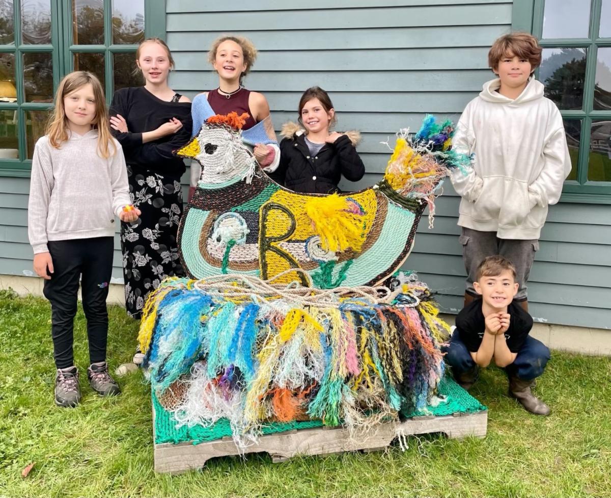Inspired by Eric Darling’s rope sculptures at Merryspring Nature Center and the work of Pamela Moulton, the Rope Sculpture group brainstormed, sketched and put their ideas to a group vote. By inventorying the materials they ensured they had enough rope to create all the elements of their design. They then determined the size and scale of the sculpture using: Pi, circumference, radius, measuring, proportion, fractions, and decimals. As they started working on the original design, they discovered that a redesign was needed and pivoted the “Chicken Lady in Nest” into “Chicken in a Nest”. The wire armature of the nest was woven and knotted over with frayed rope. They measured out the chicken’s body, determined the right proportion to the nest and cut her out before they attached rope to our plywood gal using the smallest nails they could find….lots of them!