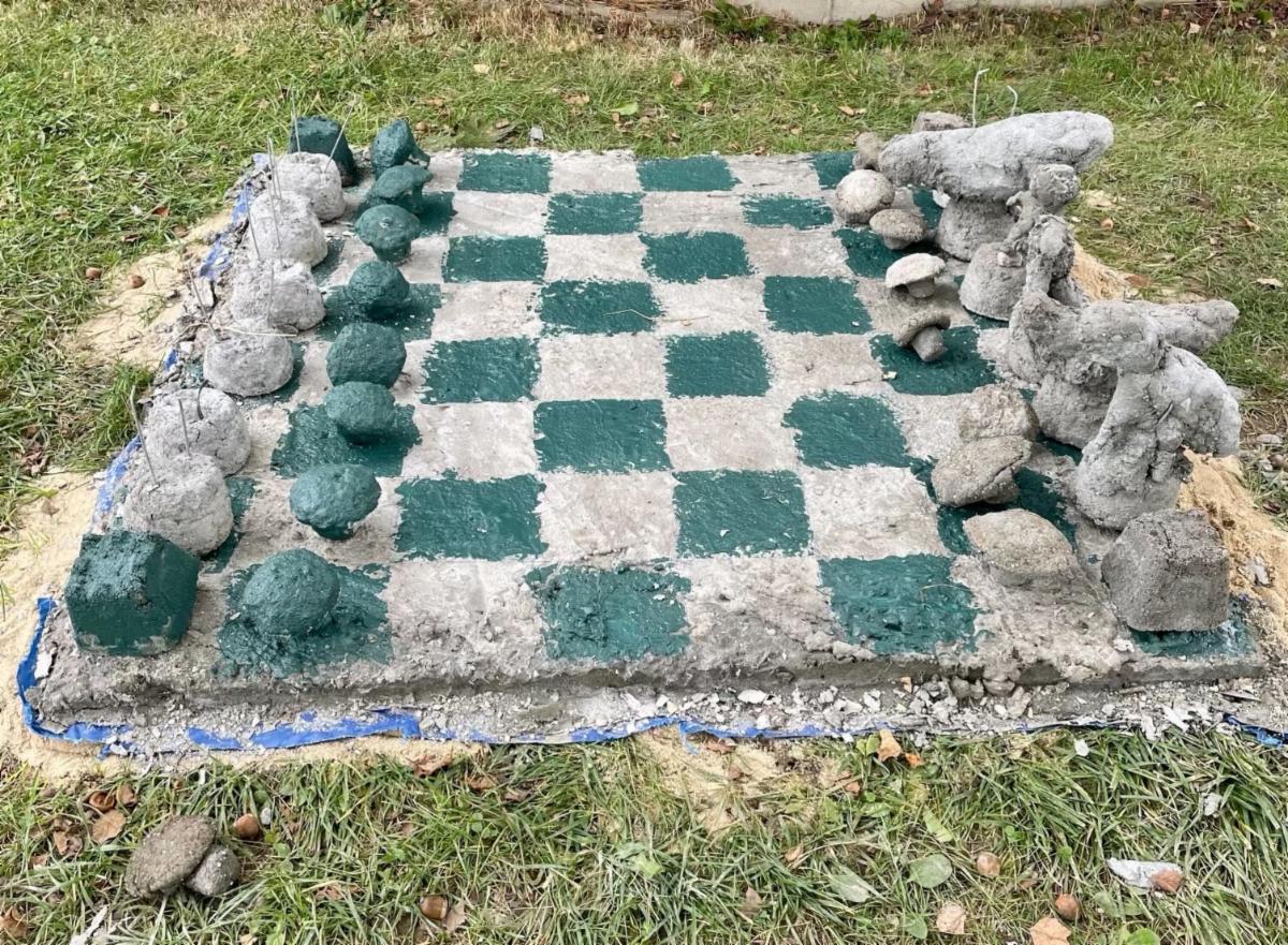 Wednesday and Thursday we built armatures from chicken wire and covered them with concrete and cement. We also poured and formed our chessboard and experimented with different mixtures of cement, sand, gravel and water. We’ve all learned a lot about how cement and concrete work and are excited to share the results of our process-focused concrete installation.