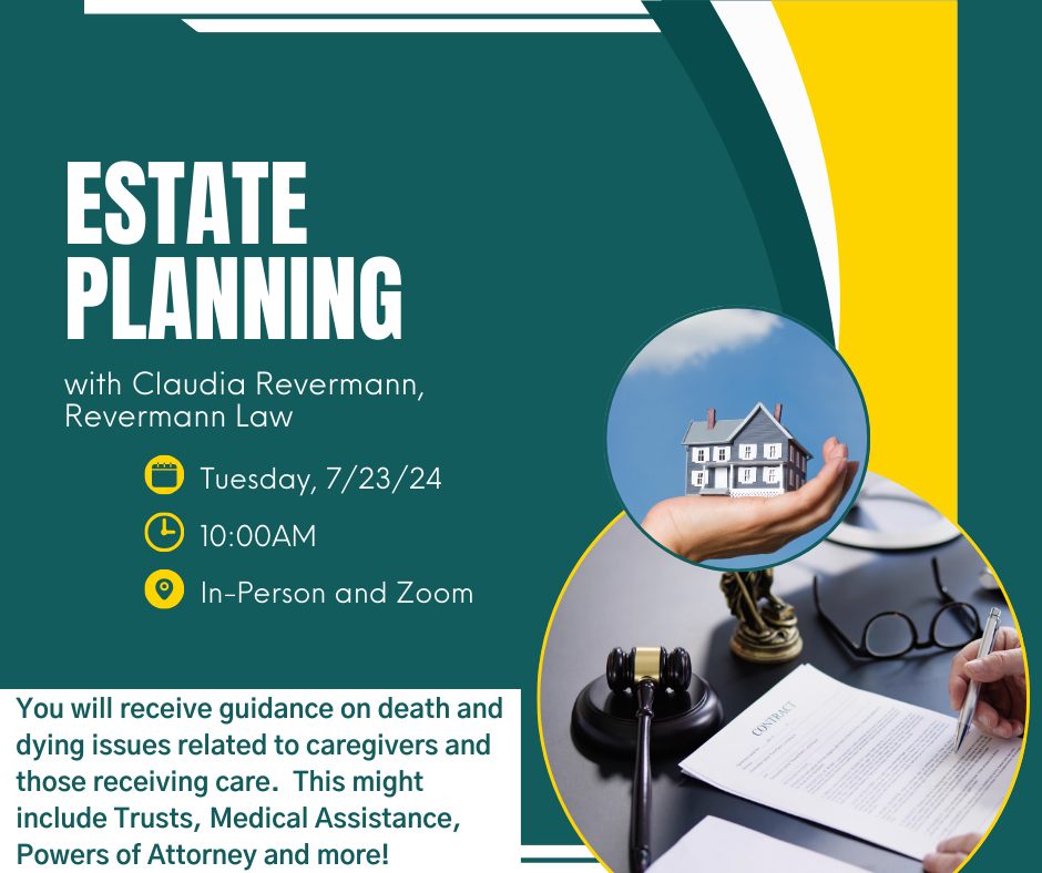 Join the Whitney Senior Center for a seminar on Estate Planning. Speaker Claudia Revermann will share guidance on death and dying related to caregivers and those receiving care. This may include Trusts, Medical Assistance, Powers of Attorney, and more.