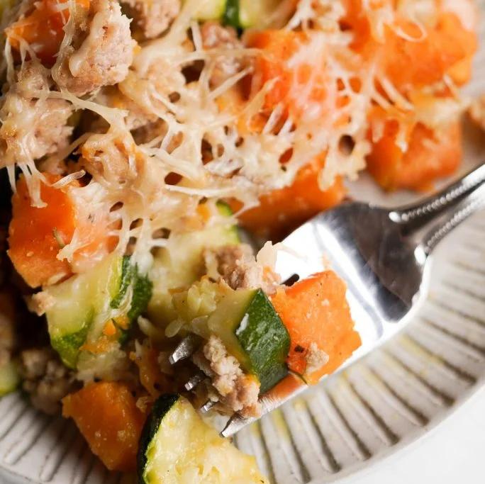 This casserole bake is made with sweet potatos, ground turkey, zucchini, parmesan cheese, and seasonings. It’s gluten-free and loaded with protein and veggies.