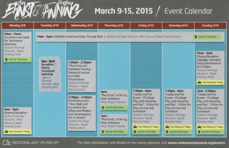 Adele Seronde Life Long Retrospective In partnership with Sedona Arts Center At Sedona Arts Center March 6-29 For More information Click here Full Listing of Adele Seronde: 60 Years of Chasing the Light Events: March 15th Adele Seronde: 60 Years of Chasing the Light Sedona Opening Reception celebrating the expansion of the exhibition into the Theatre Studio at Sedona Arts Center. Book signing and Gardens for Humanity display. 6:30 p.m. Art Encounter director Ellen Kamerling will lead a discussion tour around the galleries. March 21st "Art Is Not a Thing, Art Is a Way" Sedona Arts Center Panel Discussion 2pm in the Theatre Studio. March 25th Gardens for Humanity program and film 10:30am-12pm Sedona Arts Center March 25th Children's Workshop led by Nancy Robb Dunst Sedona Arts Center, 12:30-1:30pm March 29th Finale Adele Seronde Chasing the Light and Dance Music by Fitzhugh Jenkins band & Adele Seronde's granddaughter Katherine Perkins Sedona Arts Center 8-10pm Thursday March 12th Special Screening of Max Ernst 4pm and 7pm, Mary D Fisher Theatre Presented by The Sedona Art Museum and the Sedona Film Festival