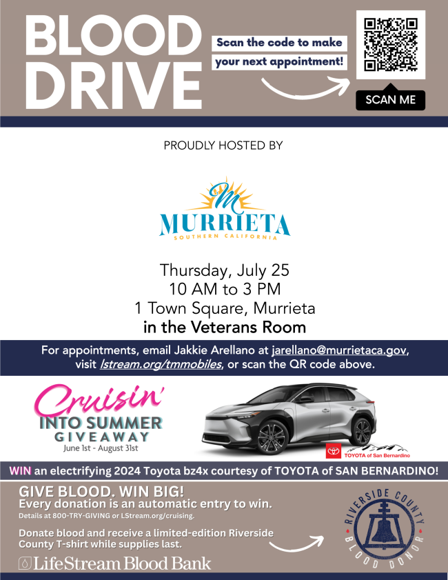 Join us on July 25, 2024 for a Blood Drive at City Hall!