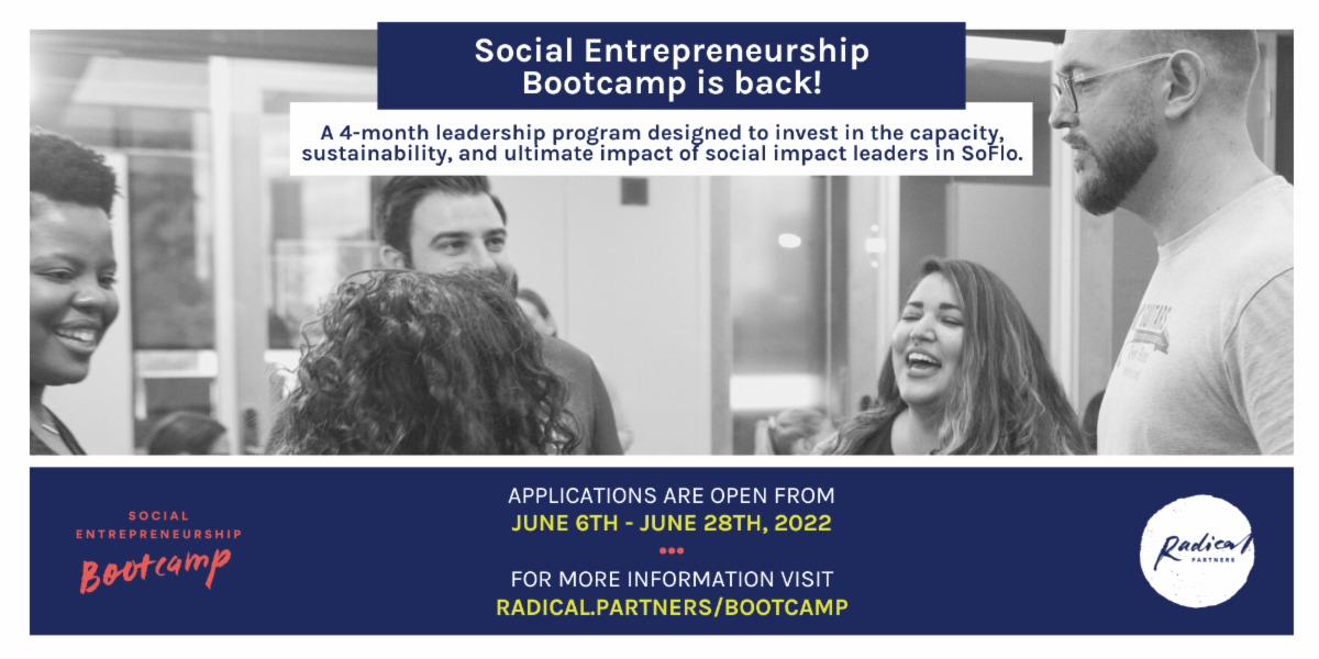 Radical Partners is searching for the next cohort of social innovators in South Florida who are working to address our region’s most pressing issues. Are you leading a for-profit social venture or non-profit with a sustainable revenue model? Are you ready to scale your impact? Radical Partners wants to invest in your skill, network, and sustainability! Apply to join the 7th cohort of Social Entrepreneurship Bootcamp by Tuesday, June 28.