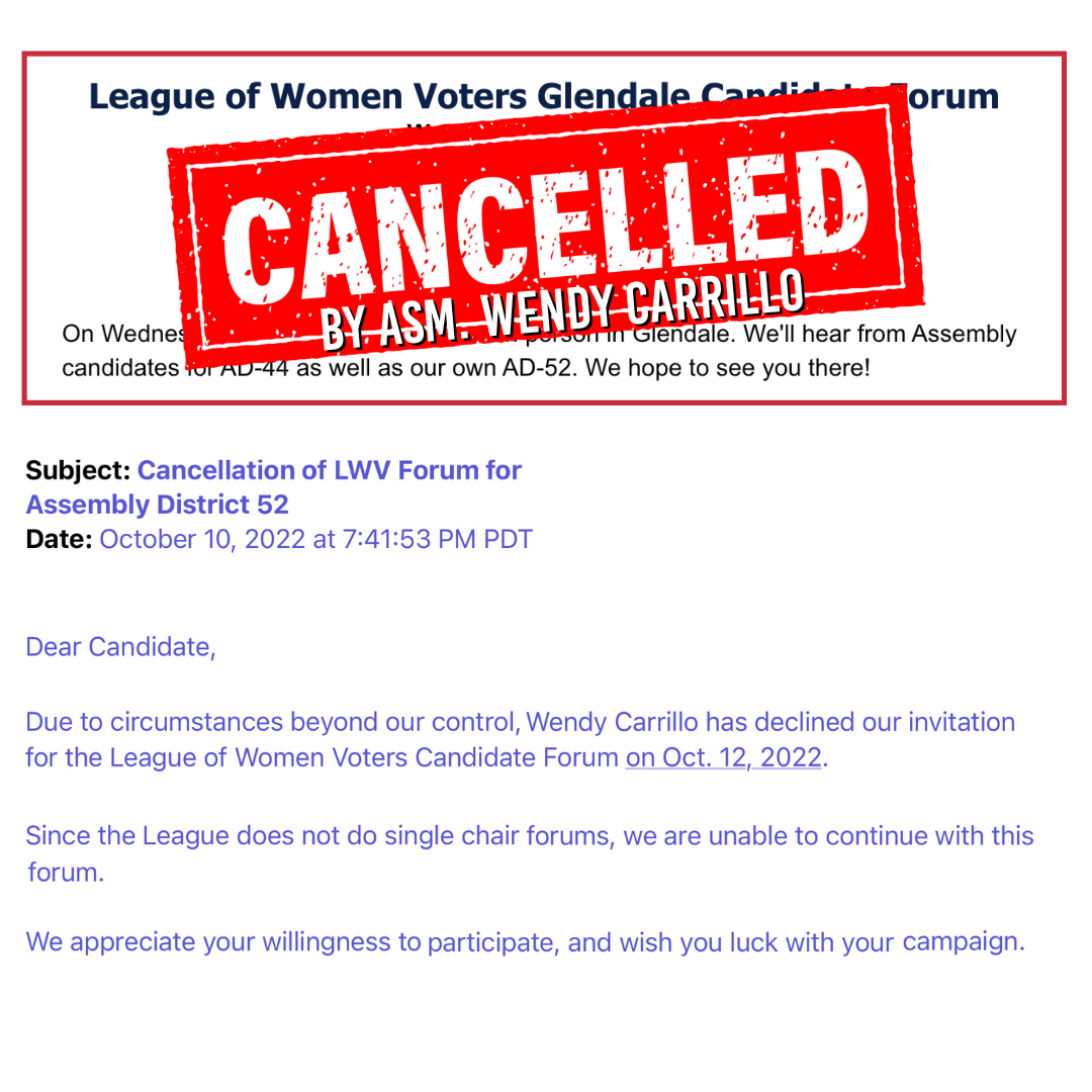 Well, late last night, we learned that Assemblymember Carrillo pulled out of our debate.