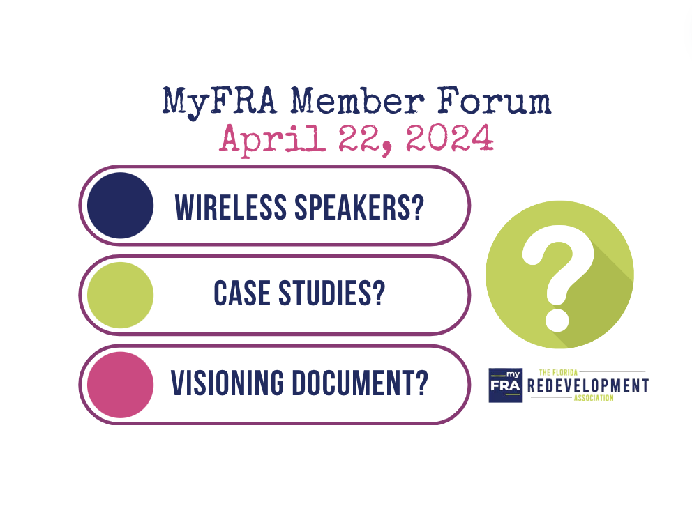 The FRA is dedicated to assisting Florida professionals and volunteers in community revitalization efforts across the state by providing a forum for members to share knowledge and common experiences through its members-only website, MyFRA, as well as providing training and professional development opportunities, revitalization news, and the tools needed for CRAs and redevelopment professionals to succeed.