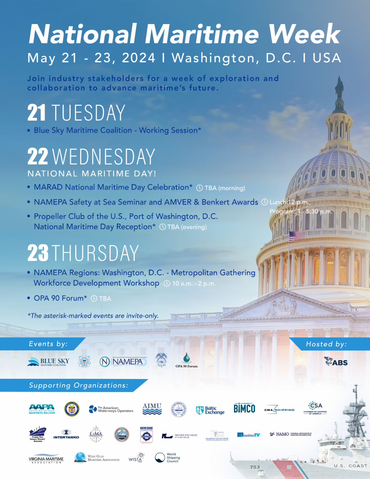 National Maritime Week, an extension of the traditional National Maritime Day observed on May 22nd, is a time to recognize and celebrate the significant achievements within the maritime industry. This initiative aims to foster unity and propel collective progress within the maritime sector. This year, the celebrations and collaborative efforts will be hosted in Washington, D.C., marking a significant opportunity for professionals, government representatives, and stakeholders to come together in recognition and support of our maritime heritage and future. Currently, we have over 40 different Supporting Organizations looking forward to this incredible week! | |