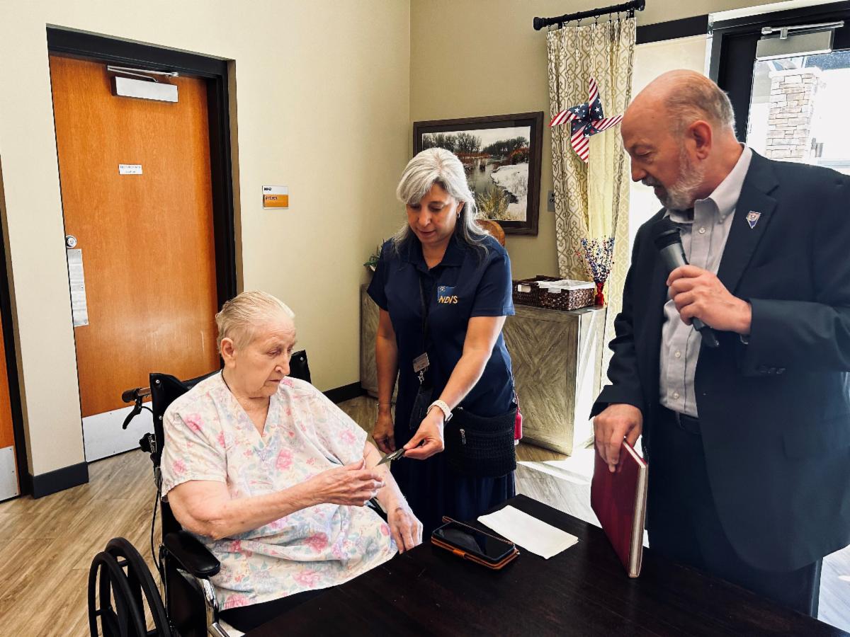 Photo: Director Wagar honors Betty, a NNSVH resident and Korean War veteran during a July 27th Korean War Recognition Ceremony at the NNSVH. Read more on the ceremony in this newsletter. | |