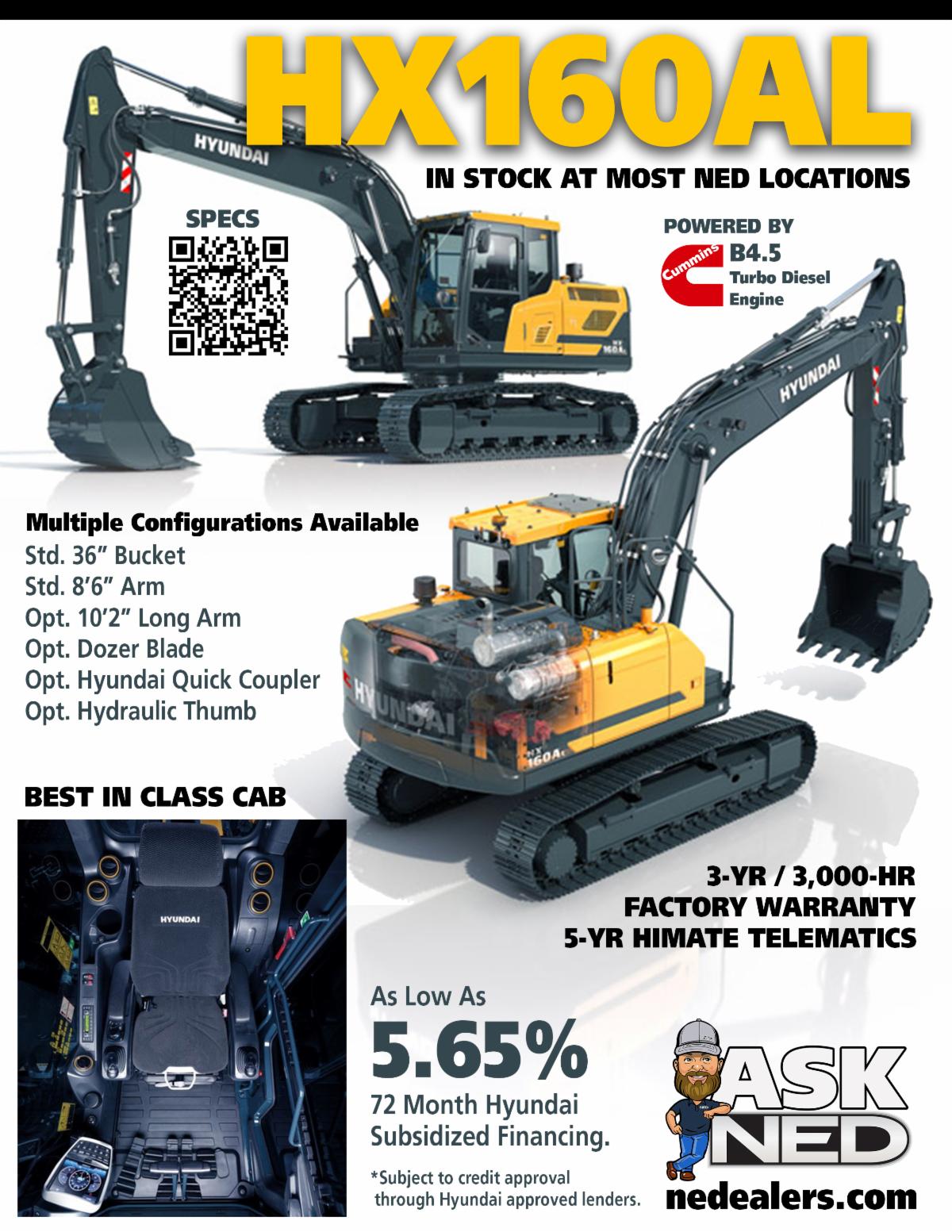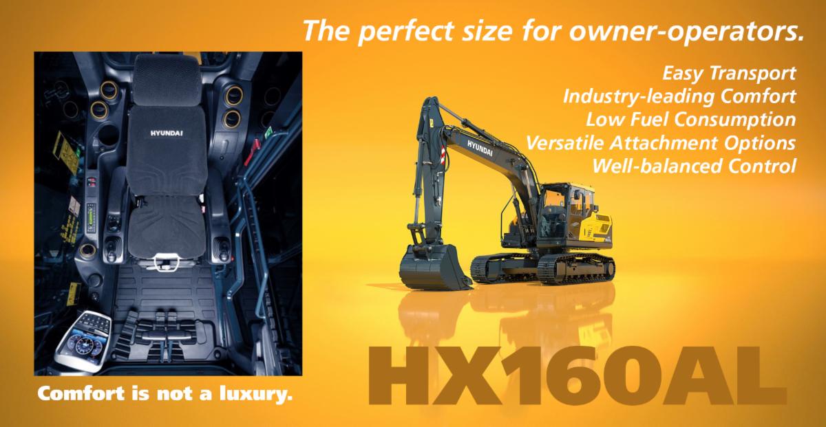 Our customers tell us that Hyundai's popular HX160AL model is the perfect size for their operations. This model packs a punch with plenty of horsepower and hydraulic flow for powerful excavation and loading applications. However, Hyundai's precision hydraulic tuning also makes pulling a grade or cutting precision slopes easy and fast.