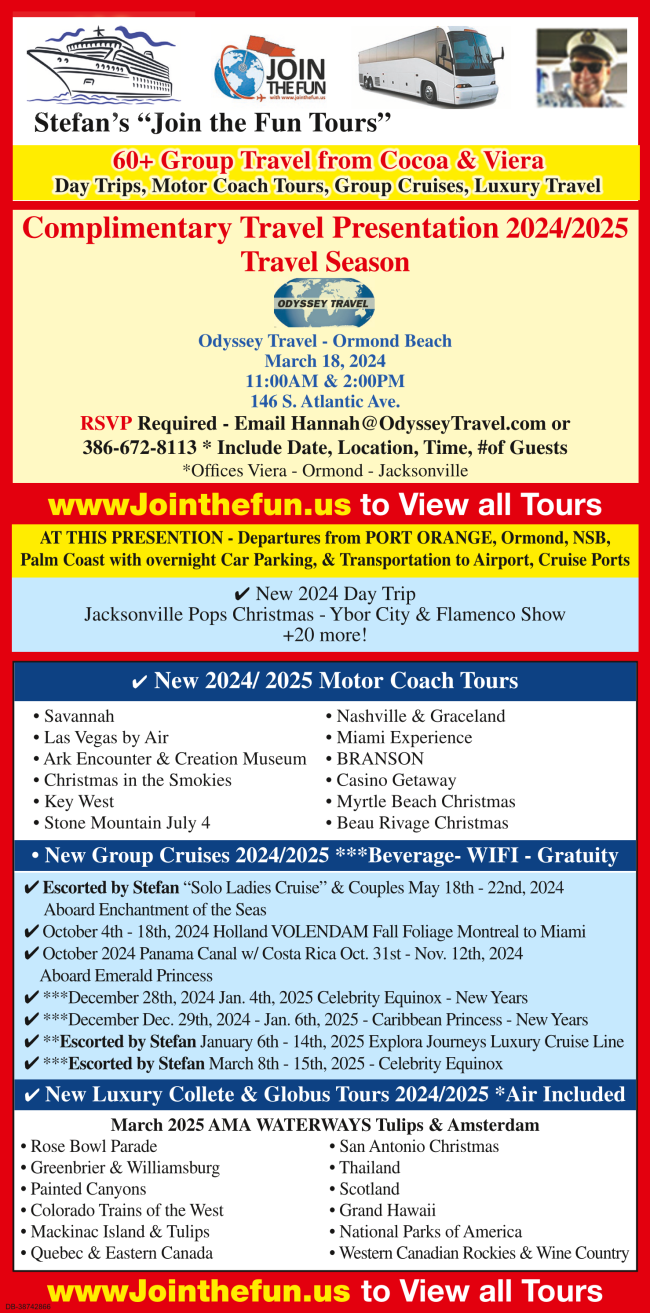 Departs: Ormond- Port Orange- New Smyrna- Cocoa