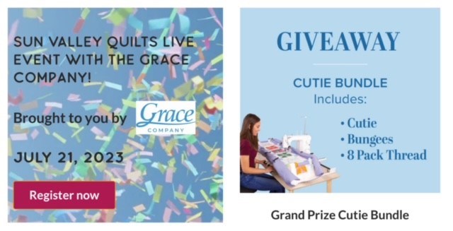 Sun Valley Quilts and the Grace Company will be co-hosting our first virtual live event. This will be an opportunity to stay in the comfort of your home (avoid those terrible afternoon temps) while learning and asking questions! There are also three incredible giveaways for those people who pre-register for this event! Have you been wanting a better understanding of the Fundamentals of Free Motion Quilting? We will be discussing this and presenting tips, hints and demos! Do you have a Cutie frame? Have you been thinking about one? We will be covering this as well! Don’t worry - we have even more to teach and talk about! Q’nique’s? Specials? Laughter and learning for FREE! Giveaways? Only if you are pre-registered - sign up now at https://events.graceframe.com/landing/sun-valley-quilts-live-event?k=sun-valley-quilts-live-event--47 | |