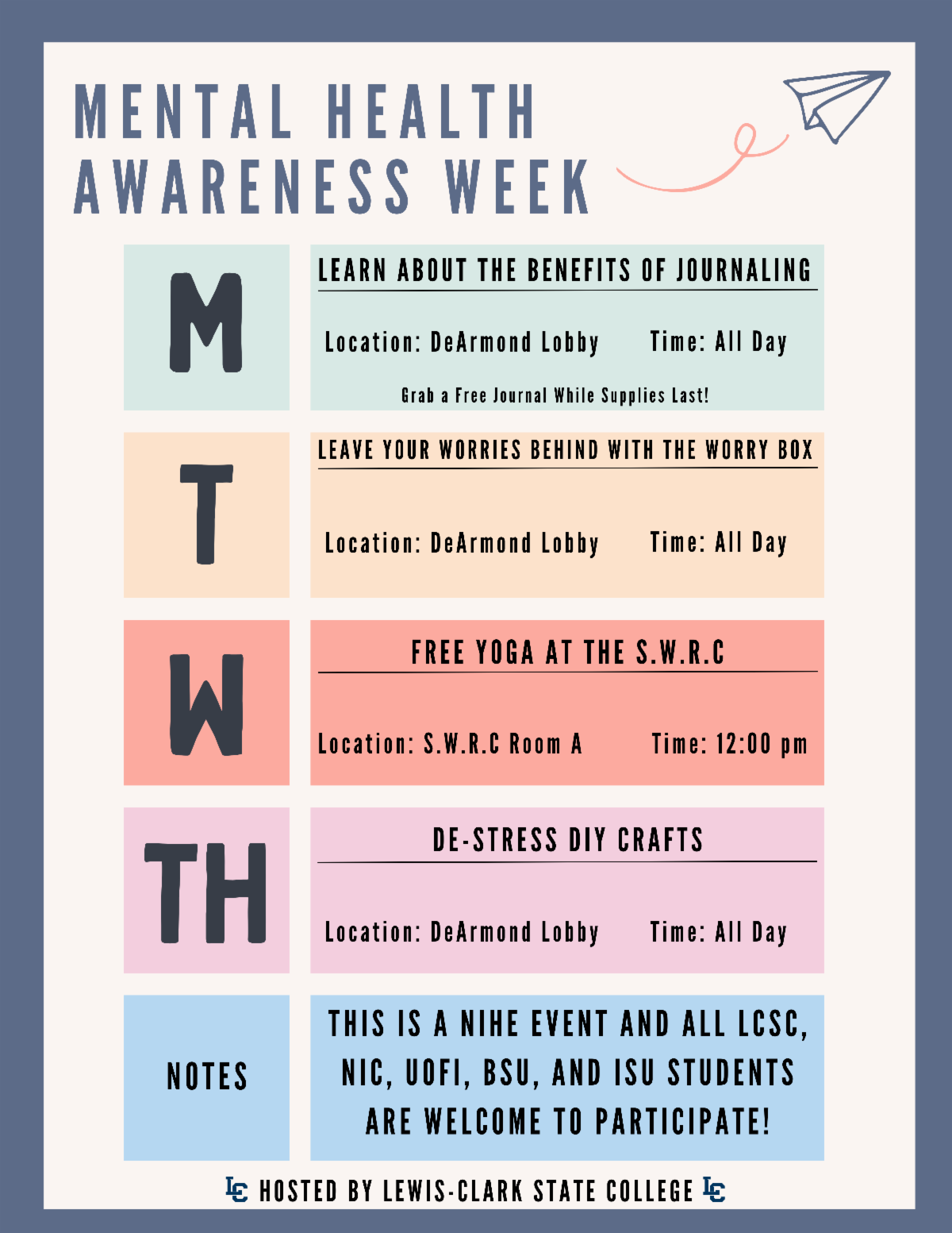 LCSC will host Mental Health Awareness Week activities from March 13 to 16 in the DeArmond Building at NIC's main campus.